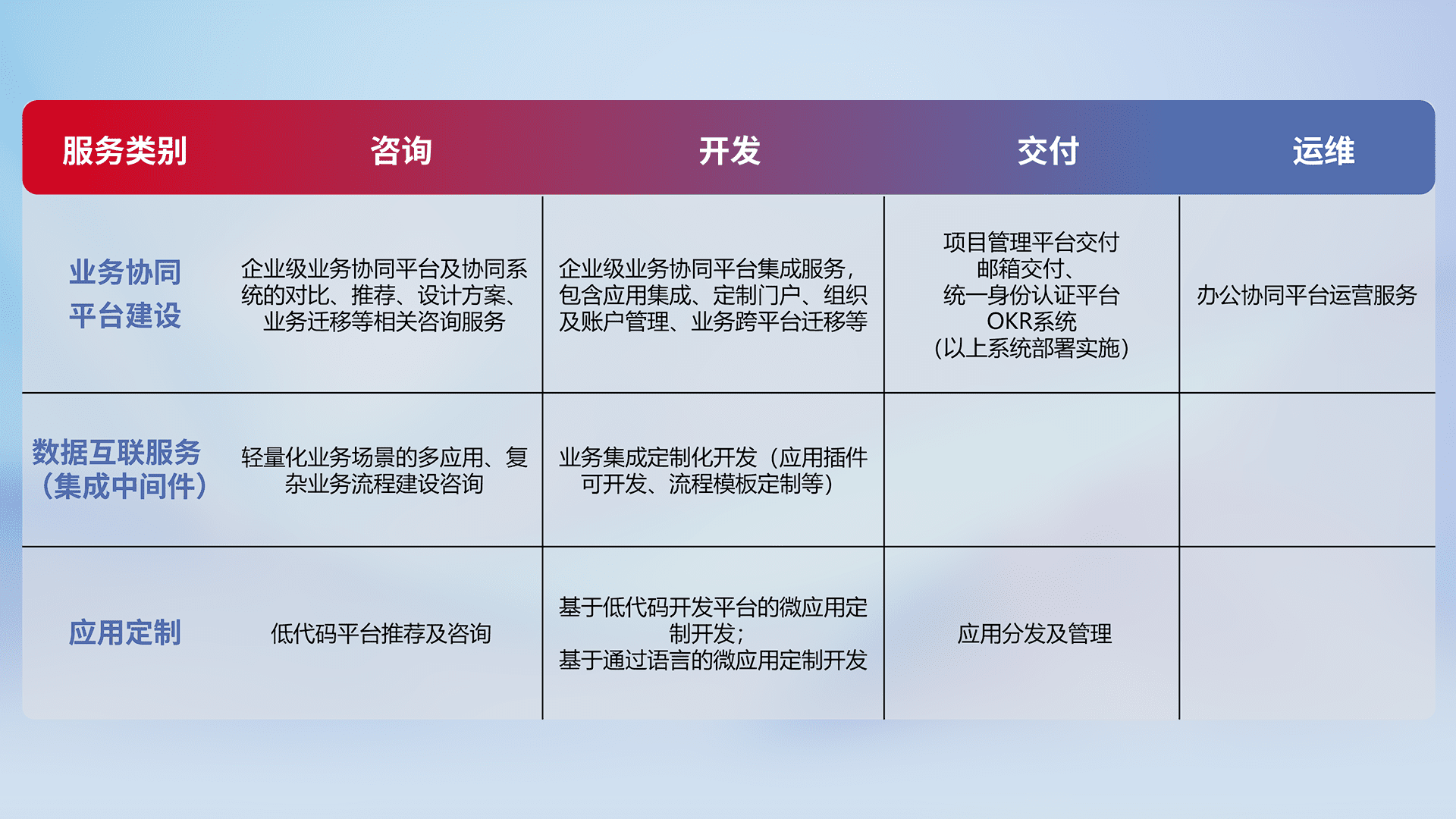 针对钉钉、、、企微、、、、IDaas等平台级产品提供产品的规划、、、方案、、、交付、、、定制化开发等服务,,,,实现如统一协同办公、、智能客户服务、、混合会议管理、、、智能数据查询、、等业务场景,,,,实现数字化转型。。。。