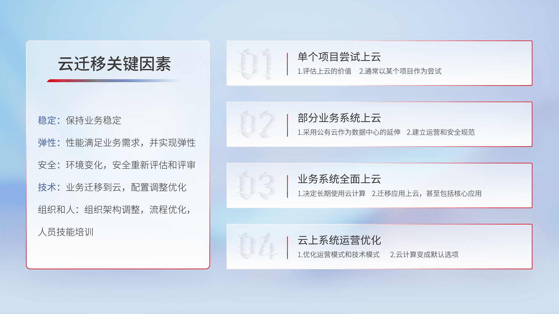 结合实际业务,,从规划设计、、、云平台选型、、云原生改造、、、数据迁移、、、、集成交付,,迁移全过程为客户识别最佳上云路径,,做好风险识别管理,,,设计网络架构、、、、身份权限、、安全审计合规、、、操作审计、、日志审计、、、监控告警策略、、、多站点容灾设计等,,,,对云上基础设施进行整体规划,,,提升IT治理水平,,以满足弹性、、、高可用、、、、高性能的需求。。。