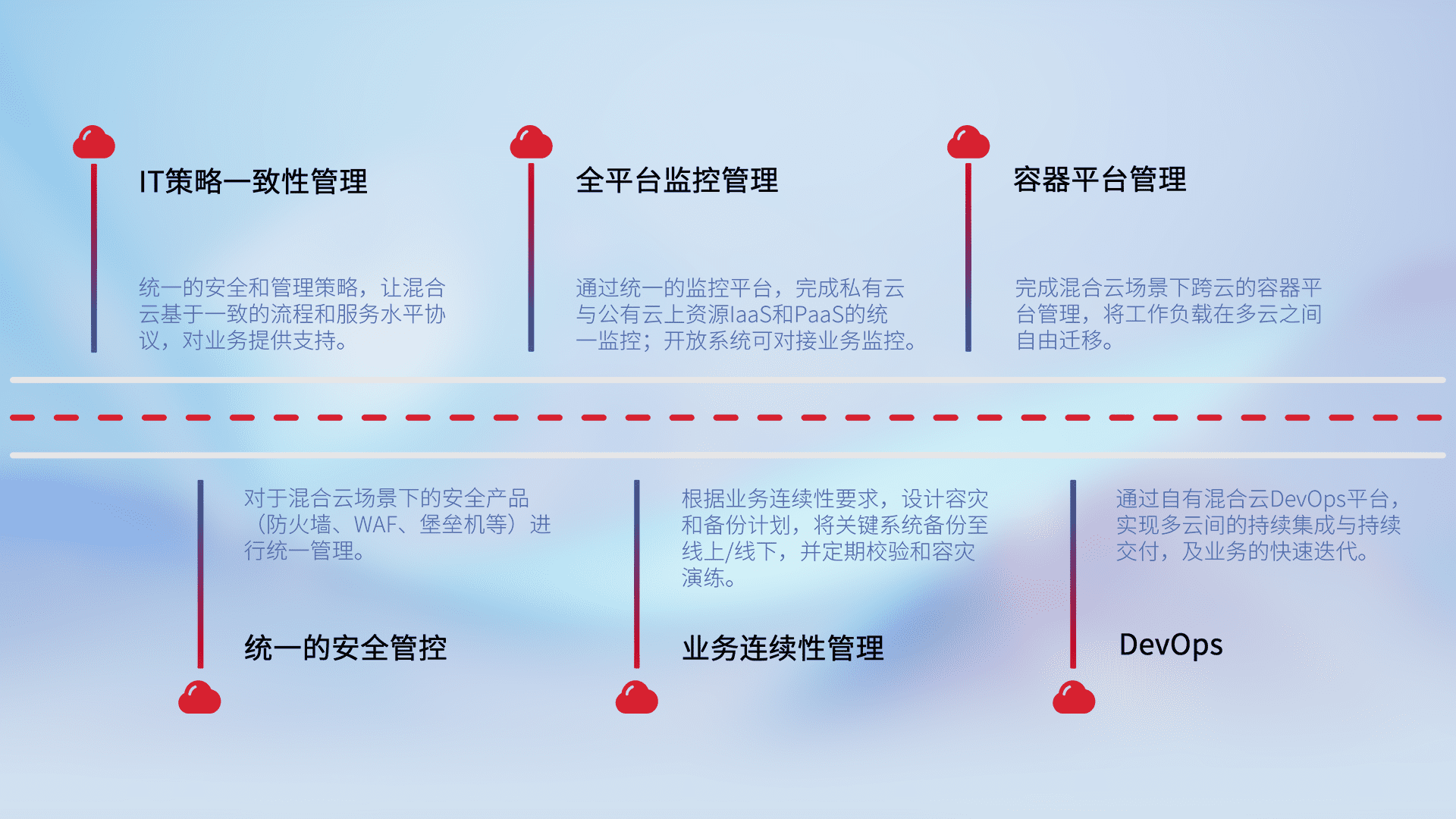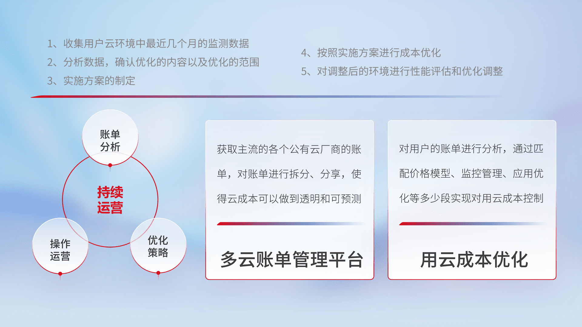 通过多云纳管,,,以统一的资源数据模型把客户的云资源进行抽象和封装,,,进而实现对多云资源的统一操作,,,,保障云资源管理的可靠性、、稳定性与可用性。。。量身定制化运维内容,,,,配置、、、开发运维、、、、补丁管理、、、备份、、、、监控、、、认证和访问管理、、、、审计和日常巡检等,,,,保障在用云过程中的可靠度,,,稳定度以及高可用率。。。